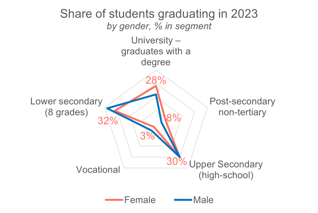 The profile of high‑school graduates confirms this pattern. In 2023, 55% of those who passed the baccalaureate exam were girls, although girls represent only around 48–49% of the population aged 18–19. This gap suggests a stronger tendency among young women to continue education and to pursue qualifications that enable professional autonomy.